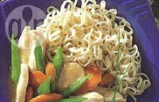 Portionen : 4 500 g ausgelöste Hähnchenbrüste 2 Knoblauchzehen 250 g grüne Bohnen 4 große Karotten ⅜ l Hühnerbrühe 2 EL Sojasauce 4 TL Speisestärke 1 TL Sesamöl 3 EL Öl 25 g ganze geschälte Mandeln Zub.: 15 Min. | Kochzeit: 15 Min. 1. Das Flei [...]