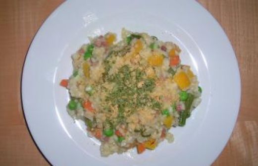 zutaten_2sp"> Zutaten für Personen Bild einstellen 1 Stk. Zwiebel 100 g Speckwürfel Öl 300 g Risotto-Reis 750 ml Brühe 1 Stk. Karotte 1 Stk. gelbe Paprika 100 g Erbsen grün tiefgefroren 100 g Stangenbohnen grü [...]
