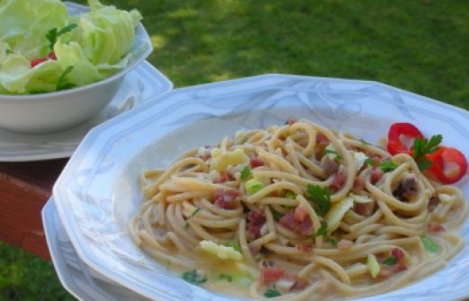 Menge Zutat 400 g Spaghetti etwas Olivenöl 150 g magerer Speck oder Schinken 1 St Zwiebel, fein gehackt 3 St Eier 50 g Parmes [...]