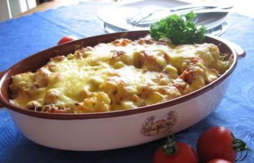 zutaten_2sp"> Zutaten für Personen Bild einstellen 1 Blumenkohl frisch, mittelgroß 4 EL Olivenöl 1 Zwiebel frisch 4 Tomaten 0.125 Liter Weißwein 1 Knoblauchzehe 100 g Gekochter Schinken 50 g Käse gerieben Salz [...]