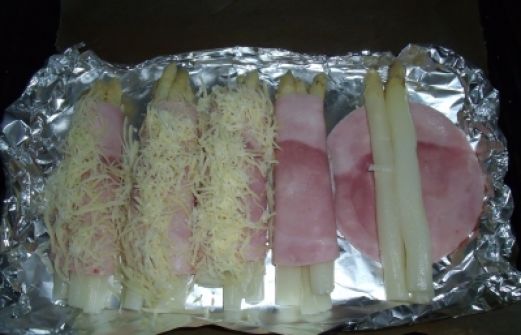 Menge Zutat 16 St Spargel frisch 4 Schb gekochten Schinken frisch vom Fleischer 4 Schb Gouda Käse etwas Muskat 1 St Zwiebel class="rez [...]