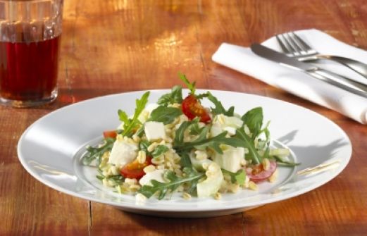 Menge Zutat 125 g Ebly Sonnenweizen 250 g Kirschtomaten 1 Salatgurke 100 g Rucola 2 Kugeln Mozzarella (à 125 g) 300 ml Joghurt-Dr [...]