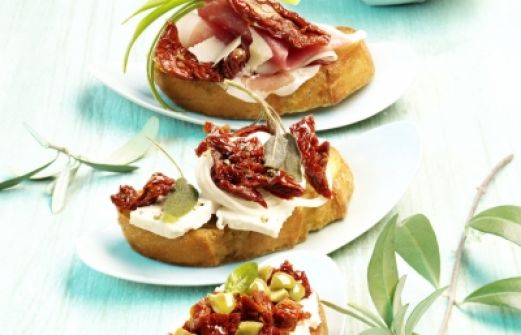 Menge Zutat Für Bruschetta mit Oliven-Tomaten-Tartar: 8 Scheiben Baguette 3 EL Olivenöl 50 g getrocknete Tomaten mit Meersalz 50 g grüne, entsteinte Toma [...]
