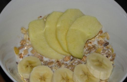 Menge Zutat 6 EL Früchtemüsli mit Rosinen 1 EL Weizenkleie 1 EL Kokosraspel 1 kleine Banane 1/2 St Apfel 100 ml Milch [...]