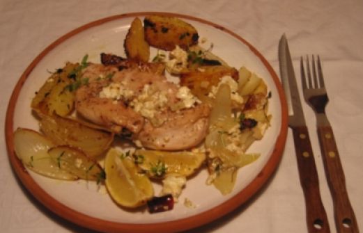 Menge Zutat 4 St Hühnerbrustfilet 1 kg Kartoffeln, klein 6 St Zwiebeln 4 St Zitronen 3 St Knoblauchzehe (gehackt) 200 g Schafskäse [...]