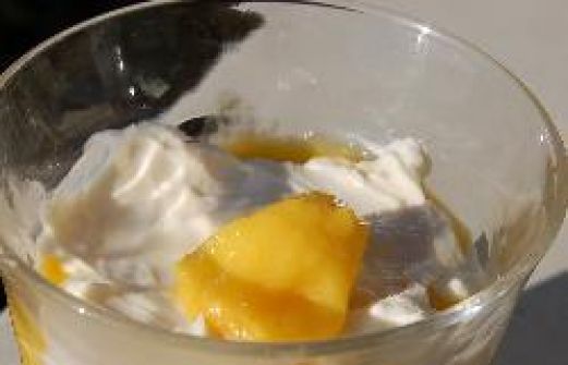 Portionen : 3 1 Becher griechischer Honigjoghurt oder anderer Sahnejoghurt mit etwas Honig gesüßt 250 g Mascarpone 1 Päckchen Vanillezucker 1 EL Rohrzucker 1 EL frisch gepresster Zitronensaft 2 reife Mangos Zub.: 15 Min. 1. Sahnejoghurt, Mascarpone, Vanil [...]