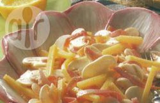 Portionen : 4 200 g Emmentaler oder Lindenberger 100 g gekochten Schinken, in Scheiben geschnitten 400 g Zuchtpilze, z. B. Champignons 2 Zitronen Für das Dressing 2 EL Olivenöl Salz weißer Pfeffer aus der Mühle Zub.: 25 Min. 1. Den Käse in Scheiben, dan [...]