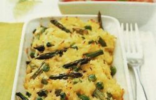Portionen : 4 1 EL zerlassene Butter 2 EL Semmelbrösel 300 g Langkorn- oder Basmati-Reis 600 ml Gemüsebrühe 150 g Tiefkühlerbsen 150 g grüner Spargel, in 5 cm lange Stücke geschnitten 3 Eier 100 g reifer Cheddar-Käse, gerieben 1/4 TL zerkleinerte getrocknete Chilis [...]