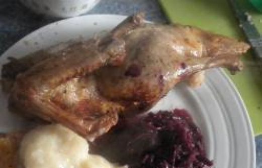 Portionen : 4 1 Ente ca. 2 kg Salz Pfeffer Majoran 1 Zweig Thymian 1 Zweig Rosmarin 1 Zwiebel 1 Apfel 2 Orangen oder ein Glas Sauerkirschen ca 500g 1/4 l Rotwein Suppenwürfel oder etwas Geflügelfond Mehl oder Stärke zum Binden Preiselbeerkompott nach Ge [...]
