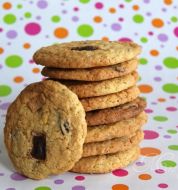 Ergibt : 30 Cookies 100 g weiße Schokoladentropfen oder weiße Schokolade, klein gehackt 20 g Rice Krispies ® oder ähnliches 200 g Mehl 3/4 TL Backnatron 1/4 TL Backpulver 100 g brauner Zucker 100 g Schokoladentropfen 40 g Haferflocken 100 g Zucker Zub. [...]