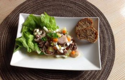 Zutaten für Personen Rezept mit Bild: Rindfleischsalat Bild einstellen 3 gekochtes Scheinben Rindfleisch, Suppenfleisch....oder was ihr übrig habt 1 gekochte Karotten 2 gekochte Eier, 4 Essiggurken 2 ge [...]