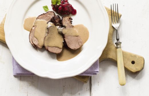 Rehkeule in Wacholderrahm Zutaten ½ Bund Thymian 4 Knoblauchzehen 2 TL Wacholderbeeren 1 TL Pfefferkörner Salz 2 Zwiebeln 2 Möhren 2 Petersilienwurzeln 2 EL neutrales Öl 1,2 kg Rehkeule (ohne Knochen, auch fein: Hirschkeule) 1 EL Johannisbeergelee 1 TL Tomatenmark 1 EL M [...]