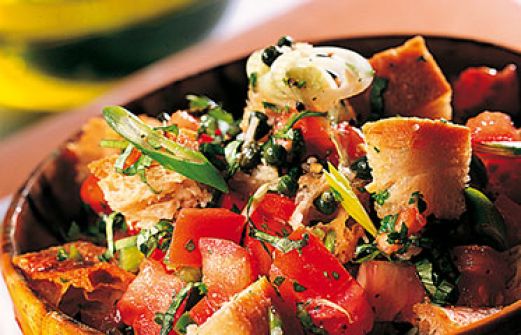 Brotsalat aus der Toskana Zutaten 150 g altbackenes italienisches Weißbrot 400 g reife Tomaten 1 kleine rote 1 kleine grüne Paprikaschote 1 Bund Frühlingszwiebeln 1 Bund Petersilie 1 Bund Basilikum 2 Knoblauchzehen 2-3 EL Rotweinessig Salz Pfeffer aus der Mühle 5 EL gut [...]