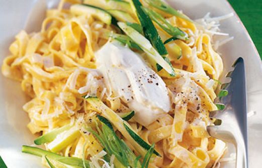 Fettuccine mit Zucchini-Sauce Zutaten 1 Zwiebel 1-2 Knoblauchzehen 1 Zucchino (ca. 200 g) 2 Frühlingszwiebeln 50 g Parmesan 300 g Fettuccine 1 EL Butter 200 ml Gemüsebrühe (Instant) 75 g Frischkäse 1 EL weißer Aceto balsamico Salz Pfeffer geriebener Parmesan zum Bestr [...]