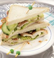 Club-Sandwich mit Hähnchen Zutaten 200 g Hähnchenbrustfilet Salz Pfeffer 2 EL Öl 4 Blätter Eisbergsalat 2 Tomaten 8 Scheiben Frühstücksspeck (Bacon) 12 Scheiben Sandwichtoast 4 EL Mayonnaise (aus dem Glas) 8 Holzspießchen guk:similarity-keywords=""> 200 g Hähnchenbru [...]