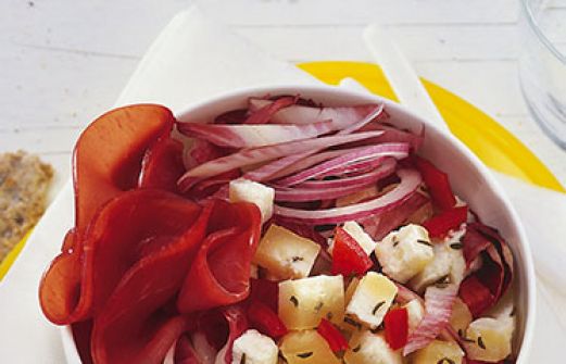 Harzer Salat Zutaten 4 EL weißer Aceto balsamico Salz Pfeffer 1 TL Kümmel 1 kleine rote Zwiebel 125 g Harzer Käse 1 Staude roter Chicorée 150 g Tomaten 6 dünne Scheiben Lachsschinken (60 g) 4 Scheiben Knäckebrot guk:similarity-keywords=""> 4 EL weißer Aceto balsami [...]