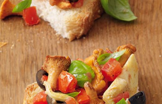 Bruschetta mit Pfifferlingen Zutaten 200 g Tomaten 100 g eingelegte Artischockenherzen 100 g schwarze Oliven (ohne Stein) 2 Stängel Basilikum 200 g Pfifferlinge (ersatzweise kleine Champignons oder Egerlinge) 1 EL Butter Salz Pfeffer 2 Knoblauchzehen 4 Scheiben Weißbrot [...]