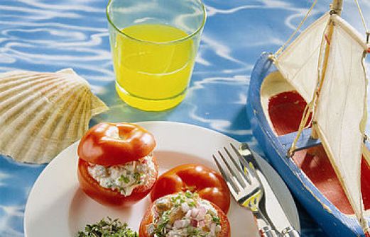 für 4 Personen 4 Matjes-Doppelfilets 1 kleine rote Zwiebel1 1 Beet Kresse Salz1 Pfeffer weiß Von den Tomaten einen Deckel abschneiden, die Tomaten aushöhlen und mit der Öffnung nach unten auf Küchenkrepp abtropfen lassen. Matjes und Zwiebel fein würfeln. Mit Hüttenkäse und ½ Beet K [...]
