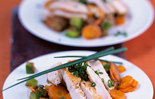Putenschnitzel mit pfannengerührten Erdnuss-Möhren Zutaten 500 g Möhren 2 grüne Paprikaschoten (à ca. 150 g) 2 EL Erdnussbutter 2 Putenschnitzel (à ca. 150 g) Salz Pfeffer 2 EL Rapsöl 2 EL Schnittlauchröllchen guk:similarity-keywords=""> 500 g Möhren , 2 grüne P [...]