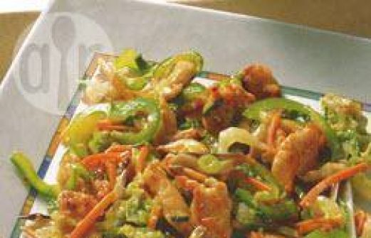 Portionen : 4 1 Hähnchen, etwa 900 g 1 Knoblauchzehe 3 schwarze Pfefferkörner 2 EL helle Sojasauce 11/2 TL Stärkemehl 1 TL Sesamsamen 1 EL Sesamöl 50 g getrocknete chinesische Pilze (Morcheln oder Champignons) 1 große grüne Paprikaschote 2 Möhren 125 g Chinak [...]