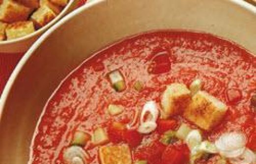 Portionen : 6 500 g vollreife Tomaten 1/2 Salatgurke 1 rote Paprikaschote 2 Knoblauchzehen 1 kleine Zwiebel 1 Scheibe Weißbrot (etwa 30 g) 2 EL Rotweinessig Salz 2 EL Olivenöl 500 ml Tomatensaft 1 EL Tomatenmark Beilagen: 1 rote Paprikaschote 4 Frühl [...]
