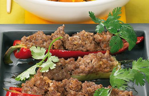 Gefüllte Spitzpaprika Zutaten 6 Wasserkastanien (Dose) 1 Stück frischer Ingwer (etwa haselnussgroß) 300 g gemischtes Hackfleisch 3 TL Speisestärke 2 EL helle Sojasauce Salz Pfeffer je 2 rote und grüne Spitzpaprika (ca. 300 g) 2 TL Sesamöl 1 EL Austernsauce 4 EL Hühnerbrühe 1 [...]
