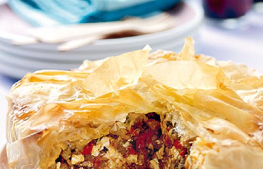 Gemüse-Lamm-Pastete Zutaten 600 g Lammfleisch (aus der Keule) 2 Zwiebeln 2 Knoblauchzehen 2 rote Paprikaschoten 2 Auberginen 6 EL Olivenöl Salz Pfeffer 3 EL Tomatenmark 1 TL getrockneter Oregano 1 TL gemahlener Kreuzkümmel 200 g Schafkäse (Feta) 1 Bund Petersilie c [...]