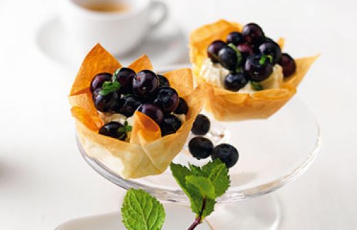 Strudelkörbchen mit Mascarpone und Minze-Heidelbeeren Zutaten 3 EL Butter 1 Blatt Strudel-, Filo- oder Yufkateig (aus dem Kühlregal; à ca. 30 x 30 cm) 1-2 Zweige Minze 1/2 Bio-Limette 60 g Heidelbeeren 1 EL Limoncello oder Limettensaft mit etwas Zucker verrührt 60 g Mascarpone [...]