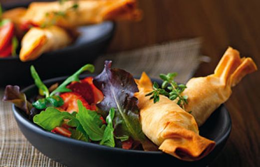 Ziegenkäse-Bonbons auf würzigem Salat Zutaten 1 Blatt Strudel-, Filo- oder Yufkateig (ca. 30 x 30 cm; aus dem Kühlregal) 4 Zweige Zitronenthymian (ersatzweise Thymian) Salz Pfeffer frisch geriebene Muskatnuss 80 g Ziegenfrischkäse 3-4 EL Butter 1 TL flüssiger Honig 80 g jun [...]