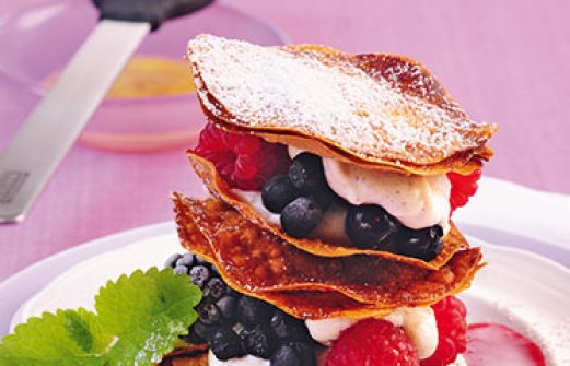 Filoteig-Lasagne mit Waldbeeren Zutaten 200 g Filo- bzw. Yufkateig 40 g Butter 2 TL flüssiger Honig 100 g Mascarpone (ital. Frischkäse) 50 g Magerquark 20 g Zucker Mark von 1/2 Vanilleschote 100 g Sahne 125 g Himbeeren je 100 g Brombeeren und Heidelbeeren 1 EL Puderzucker [...]