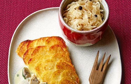 Zander mit Kartoffelschuppen auf Riesling-Sauerkraut Zutaten 720 g rohes Sauerkraut 2 Zwiebeln 100 g Gänseschmalz 750 ml trockener Riesling 10 Korianderkörner 1 Lorbeerblatt 5 Wacholderkörner 1 Thymianzweig 4 Gewürznelken 4 große Kartoffeln 170 g Butter 50 g Kartoffelstär [...]