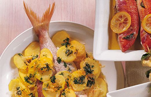 Dorade mit Kartoffeln Zutaten 1 küchenfertige große Dorade (etwa 2 kg) Salz Pfeffer, frisch gemahlen 4 große Kartoffeln 1 Bund Petersilie 2 Knoblauchzehen 1/8 l Olivenöl 1 EL Butter für die Form 2 EL frisch geriebener Pecorino guk:similarity-keywords=""> 1 küchenfer [...]