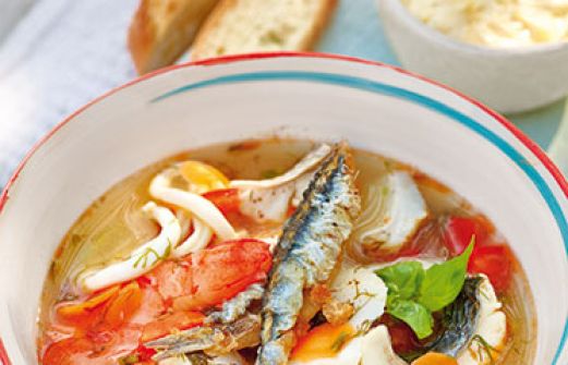 Fischsuppe Zutaten 500 g ungeschälte rohe Garnelen 1,7 kg sonnengereifte Tomaten 6 Knoblauchzehen 4 Frühlingszwiebeln 6 EL Olivenöl 2 Doraden (vom Fischhändler filetieren lassen, die Karkassen aber auch mitnehmen) 1 Schuss Grappa 1/2 l Weißwein 300 g gemischte weiße Fischfile [...]