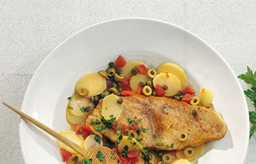 Schwertfisch aus Messina Zutaten 3 Kartoffeln Salz 2 reife Tomaten 100 g grüne Oliven ohne Stein 4 Scheiben Schwertfisch (je 200 g) Pfeffer, frisch gemahlen Mehl zum Wenden 4 EL Olivenöl 100 ml Weißwein 50 g Kapern (abgetropft) 1/2 Bund Petersilie guk:similarity-keywo [...]