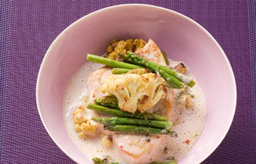 Ingwersauce zu Schwertfisch und Spargel Zutaten 1 Stück frischer Ingwer (ca. 10 g) 200 ml Asiafond 200 g Sahne 2 TL Speisestärke abgeriebene Schale von 1/2 Bio-Limette Chiliflocken Salz 1 Bund Thai-Spargel (ca. 250 g) 1 kleiner Blumenkohl (ca. 500 g) 3 EL Öl Currypulver 4 S [...]