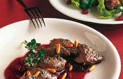 Lammfilet mit Granatapfel-Kirsch-Sauce Zutaten 4 Lammfilets (à 60-70 g) 1 TL getrockneter grüner Pfeffer 1 Bund frischer Thymian 2-3 EL Öl 1 EL Pinienkerne 1/2 Granatapfel 200 ml Kirschsaft 1 EL Speisestärke 1 TL getrockneter Oregano 2 EL Granatapfelsirup 1/2-1 TL Zucker g [...]