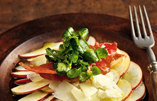 Apfelscheibchen mit Kresse, Schinken und Pecorino Zutaten ½ Bio-Zitrone 100 ml Olivenöl Salz, schwarzer Pfeffer aus der Mühle 1 Bund Brunnenkresse 6 Äpfel (Cox-Orange) 2 EL Olivenöl 12 Scheiben geräucherter Schinken (Parma oder San Daniele) 120 g Pecorino guk:similarity-keywor [...]