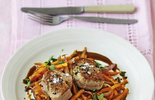 Schweinefilet mit Ingwerkürbis und Orangen-Balsamico-Sauce Zutaten 4 Schweinemedaillons (à ca. 70 g) Salz schwarzer Pfeffer aus der Mühle 3 TL Rapsöl 50 ml frisch gepresster Orangensaft 200 ml Rinderbrühe 15-20 g frischer Ingwer ½ kleiner Hokkaido-Kürbis (ca. 250 g Fruchtfleisc [...]