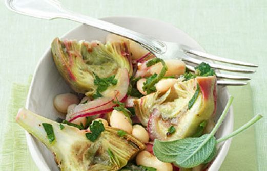 Artischocken-Bohnen-Salat Zutaten 2 Knoblauchzehen 2 Lorbeerblätter Salz 300 g frisch gepalte weiße Bohnen (ersatzweise 150 g getrocknete weiße Bohnenkerne) 4-5 EL Zitronensaft 6 EL Olivenöl 6 EL Gemüsebrühe (Instant) Pfeffer 1 rote Zwiebel 3-4 Zweige Bohnenkraut 1/2 Bund [...]