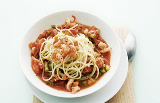 Spaghetti mit Garnelen-Bolognese Zutaten 500 g kleine Garnelen (küchenfertig) 400 g Spaghetti Salz 1 Zwiebel 2 Knoblauchzehen 1 Möhre 100 g Knollensellerie 1 kleiner Zucchino 2 EL Olivenöl 1 Dose stückige Tomaten (400 g) 200 ml Geflügelbrühe 1 Priise Cayennepfeffer 1 Spri [...]