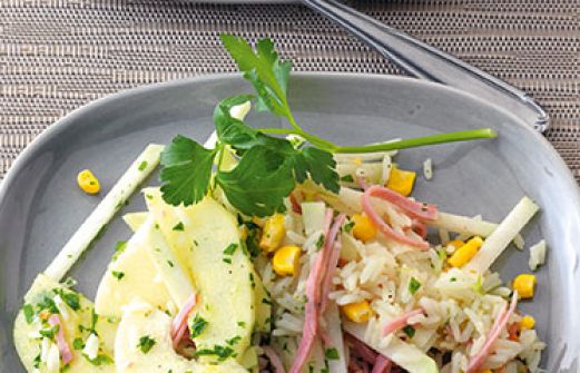 Kohlrabi-Reis-Salat mit Schinken Zutaten 125 ml Gemüsebrühe 50 g Langkornreis 100 g Kohlrabi 1 Apfel 100 g gekochter Schinken 1 Frühlingszwiebel 50 g Maiskörner (aus der Dose) 1/2 Bund Petersilie 2 EL Apfelessig 1 EL Rapsöl Jodsalz Pfeffer guk:similarity-keywords=""> [...]