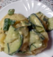 Portionen : 4 1 kg Kartoffeln, in der Schale gekocht (am besten schon am Vortag) 1 EL Rapsöl 2 EL Weinessig 1 TL scharfer Senf schwarzer Pfeffer aus der Mühle Salz 1 Bund Schnittlauch, klein geschnitten 1 Salatgurke, in feine Scheiben geschnitten 1 große Zwiebel, g [...]