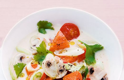 Kokossuppe mit Süßkartoffeln Zutaten 1 kleine Süßkartoffel (ca. 250 g) 2 Frühlingszwiebeln 100 g kleine Champignons 100 g Kirschtomaten 350 ml Gemüsebrühe 250 ml Kokosmilch 1 TL Zitronengraspaste (aus dem Asienladen) 1 TL Ingwerpulver 1-2 EL Limettensaft 1 Prise Pul biber (t [...]