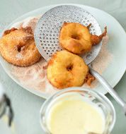 Portionen : 25 4 große Äpfel 1 Löffel Zitronensaft Butterschmalz zum Ausbacken (ca. 1,5 kg) Für den Weinteig: ¼ l Weißwein 220 g Mehl 35 g Zucker 1 Prise Salz abgeriebene Schale von ½ unbehandelten Zitrone 3 Eiweiß Zum Garnieren: Zimtzucker oder Puderz [...]
