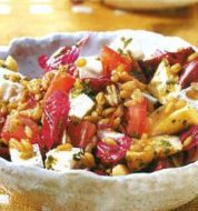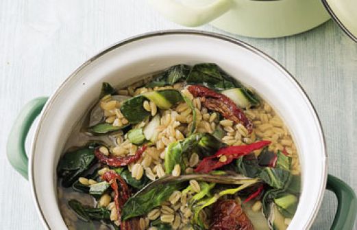 Mangold-Grünkern-Topf Zutaten 200 g Grünkern Salz 800 g Mangold 10 in Öl eingelegte, getrocknete Tomaten 8 eingelegte Peperoni (aus dem Glas) 60 g Butter 800 ml Gemüsefond (aus dem Glas) 2 EL Crème fraîche 1 TL Zucker Pfeffer 1-2 EL frisch gepresster Zitronensaft 4 Scheib [...]