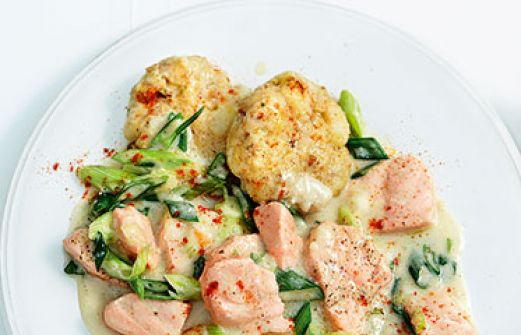 Lachs mit Semmeltalern Zutaten 1 Packung fertiger Semmelknödelteig (500 g, aus dem Kühlregal) Salz 500 g Lachsfilet 1 großes Bund Frühlingszwiebeln 1 EL Öl 300 ml Fischfond (aus dem Glas) oder Gemüsebrühe 5-6 EL lösliche Haferflocken 100 g Frischkäse Pfeffer aus der Mühle r [...]