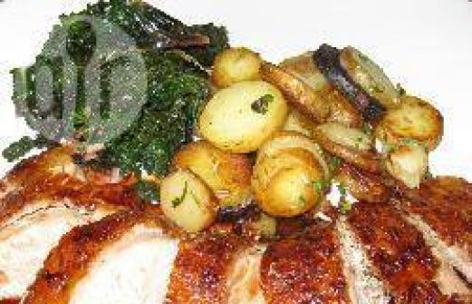 Ergibt : 3 -4 Portionen 1 küchenfertige Ente (ca. 1,5 kg) Salz schwarzer Pfeffer aus der Mühle 3 eher saure Äpfel (Granny Smith, Boskop, etc), geschält, geachtelt und Kerngehäuse entfernt 100 g Zwiebeln, geschält und geachtelt 1 Bund Thymian, von 2 Stengeln Blätter abzu [...]