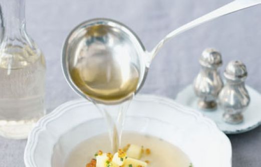 Kartoffel-Consommé mit Kaviar Zutaten 1 Schalotte 1 Lorbeerblatt 1 Nelke 1/4 Bio-Zitrone 500 g festkochende Kartoffeln 800 ml Fischfond 200 ml Weißwein Salz 300 g Fischfilet 2 Bund Schnittlauch 2 Eiweiß 2 EL Öl 4 Scheiben Baguette 4 TL Forellenkaviar guk:similarity-key [...]