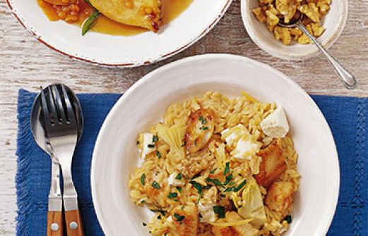 Zitronenhuhn Zutaten 1 Bio-Zitrone 500 g Hähnchenbrustfilet Salz Pfeffer 2 Knoblauchzehen 100 g Schafkäse (Feta) 50 ml Olivenöl 250 g griechische Reisnudeln 1/2 l Geflügelbrühe 100-200 ml Milch 1 Glas Artischockenherzen (180 g Abtropfgewicht) 1/2 Bund Petersilie 50 g W [...]