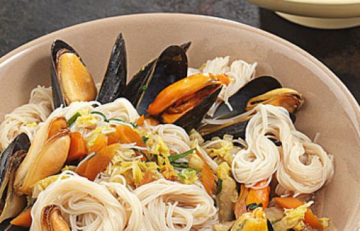 Muscheln aus dem Wok Zutaten 1 1/2 kg Miesmuscheln 3 Möhren 1/2 Chinakohl (etwa 400 g) 1 Bund Schnittlauch 2 Knoblauchzehen 250 g schmale Reisnudeln 5 EL neutrales Öl 2 getrocknete Chilischoten 1 TL Fenchelsamen 4 EL Sojasauce guk:similarity-keywords=""> 1 1/2 kg Mie [...]